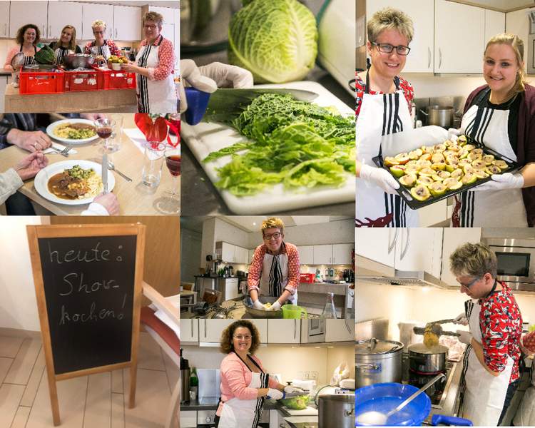Es brutzelt und brodelt, hier wird geschnippelt, dort geraspelt. Und tatsächlich schauen viele Neugierige und Hungrige vorbei, um zu gucken, was in der Küche los ist. Sie alle – Bewohner, Angehörige, Mitarbeiter – sind eingeladen, an der großen Tafel mit zu essen. „Die Dame ließ sich Tage lang nicht außerhalb ihres Zimmers blicken“, staunt eine ehrenamtliche Mitarbeiterin erfreut, als sie eine Patientin auf den Beinen erblickt. Und auch der Herr im blauen Jogginganzug sei eher zurückhaltend. Dass er in der Küche nach dem Rechten sieht, freut alle Beteiligten. Die Ehrenamtliche hat eine Erklärung: „Das Gewusel, das Lachen - das zeigt, dass hier ganz normales Leben ist.“ Und auf dem Herd und der Arbeitsplatte Chaos: „Es ist nicht einfach, für so viele zu kochen. Wir mussten ein bisschen improvisieren, aber die Zusammenarbeit hat bestens funktioniert, wir sind ein gutes Team“, so Nina Feldmann.