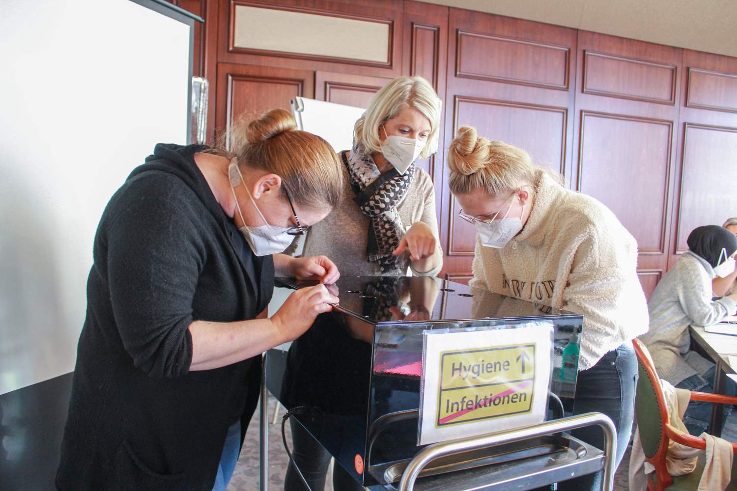 Diana Paunovic macht sich fleißig Notizen. „Je öfter ich etwas übe, desto eher bleibt es langfristig hängen“, ist sie sich sicher. Für sie ist das Elisabeth Krankenhaus Recklinghausen keine unbekannte Umgebung. Die 40-Jährige war bereits fünf Jahre lang als Servicekraft in den Patientenzimmern unterwegs. „Ich habe mich entschieden in die Pflege zu gehen, einen ganz neuen Lebensabschnitt zu beginnen.“ Und das aus gutem Grund: „Ich arbeite einfach gerne mit Menschen, mich erfreut das Lächeln der Patienten, wenn man ihnen hilft.“ Die 17-Jährige Katharina Seeger nickt. „Das hört sich vielleicht komisch an, aber das ist wirklich so“, bekräftigt die Auszubildende. Für sie ist es vor allem das Zwischenmenschliche, das sie an dem Beruf reizt: „Ich bin ein sehr sozialer Mensch.“