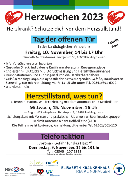 Unsere kardiologischen Experten stehen außerdem am Donnerstag, 9. November, 11 bis 13 Uhr, bei unserer Telefonaktion in Kooperation mit dem Medienhaus Bauer am Telefon bereit. Chefarzt Dr. Lawo, Oberärztin Dr. Daub und Oberarzt Dr. Jegodka beantworten Fragen rund um das Thema „Corona – eine Gefahr für das Herz?“. Die Leitung ist nur während der Aktion freigeschaltet: 02365/107-1111.