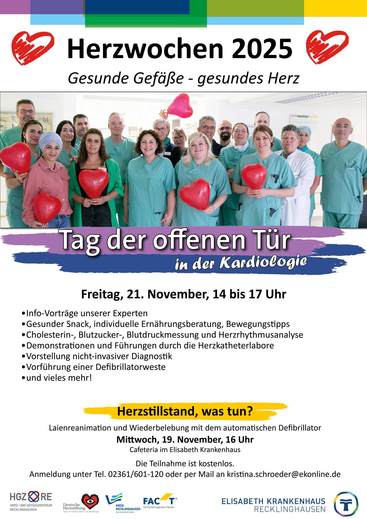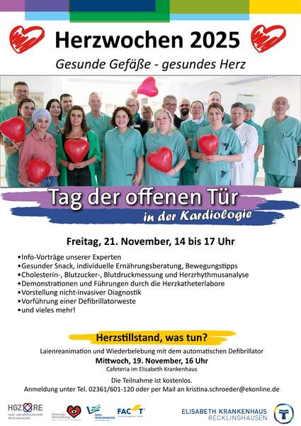 Herz-Kreislauf-Erkrankungen bleiben die häufigste Todesursache in Deutschland. Laut dem aktuellen Deutschen Herzbericht sind Durchblutungsstörungen durch verengte Herzkranzgefäße weiterhin der Hauptgrund für tödliche Herzleiden. Unter dem Motto „Gesunde Gefäße – gesundes HERZ. Den Herzinfarkt vermeiden“ widmen sich die diesjährigen Herzwochen der Deutschen Herzstiftung im November der Koronaren Herzkrankheit (KHK) und dem Herzinfarkt. Deshalb beteiligt sich die Kardiologie des Elisabeth Krankenhauses Recklinghausen auch in diesem Jahr wieder mit einem Tag der offenen Tür am Freitag, 21. November.