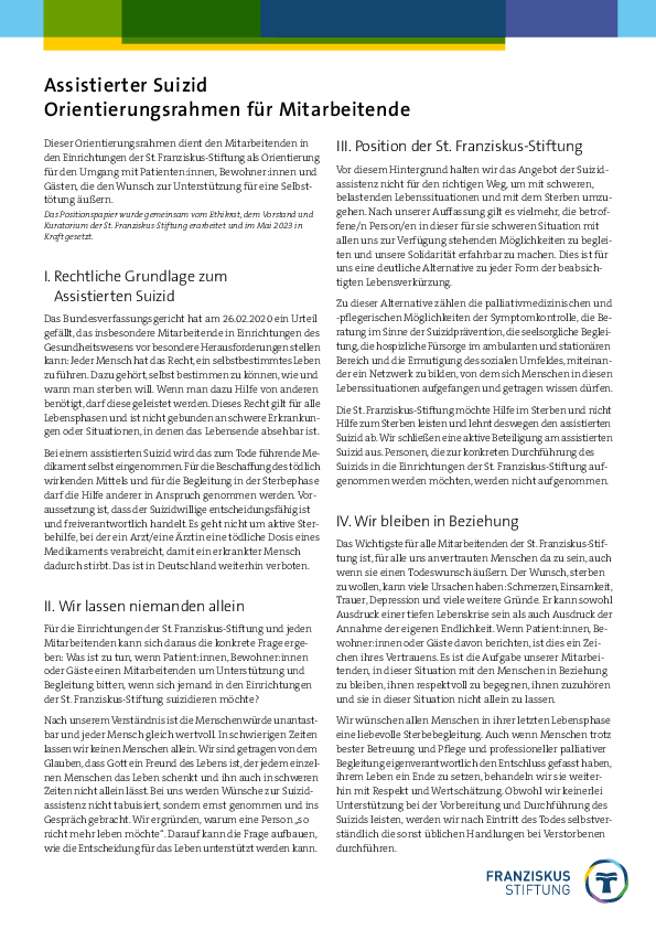 Anstelle der beabsichtigten Lebensverkürzung setzt sich die Franziskus Stiftung für deutliche Alternativen ein. Dazu zählen alle Formen der Suizidprävention, die palliativ-medizinischen und -pflegerischen Möglichkeiten der Symptomkontrolle, die Beratung im Sinne der Lebensbejahung, die seelsorgliche Begleitung, die hospizliche Fürsorge im ambulanten und stationären Bereich und die Ermutigung des sozialen Umfeldes, miteinander ein Netzwerk zu bilden, von dem sich Menschen in diesen schwierigen Lebenssituationen aufgefangen und getragen wissen dürfen. Die Franziskus Stiftung möchte die ihr anvertrauten Menschen nicht alleine lassen und Hilfe im Sterben und nicht Hilfe zum Sterben leisten. Eine enge Begleitung aller daran beteiligten Menschen ist dabei unabdingbar – dies gilt auch für die Mitarbeitenden selbst: „Uns ist es wichtig, die Mitarbeitenden durch regelmäßige und umfangreiche Schulung gesprächsfähig zu machen, wenn Wünsche nach lebensverkürzenden Maßnahmen an sie herangetragen werden und sie auch mit einem Supervisionsprozess zu unterstützen,“ so Dr. Nils Brüggemann, Vorstandsvorsitzender der Franziskus Stiftung.